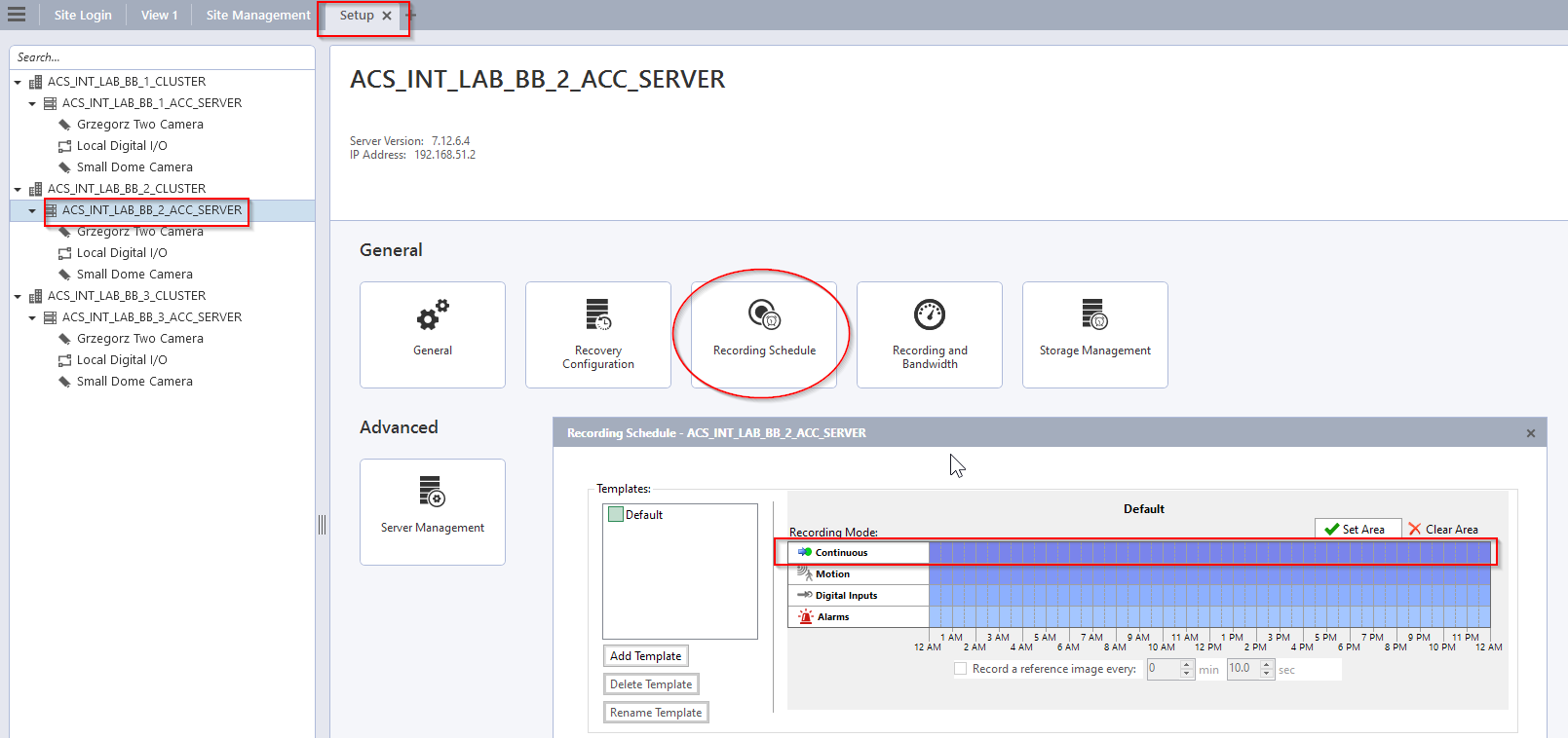 Important: For correct operating of recorded video access functionality, you have to configure continuous mode of recording in the ACC. This is configured using ACC client. In "Site Setup" tab, select the entry related to your ACC server, select the "Recording Schedule" option and mark all tiles in the "Continuous" section (refer to the figure).