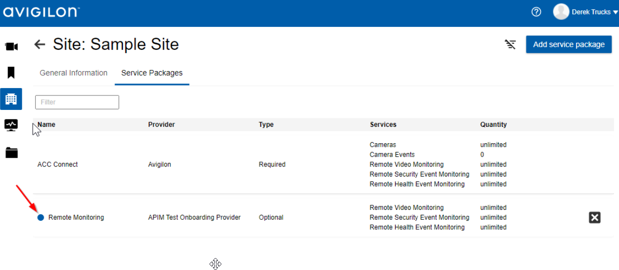 In the list of service packages for the site, the new item will be present. The blue dot in the front of the name indicates that the request for remote monitoring has been sent to the remote monitoring provider and is pending approval.