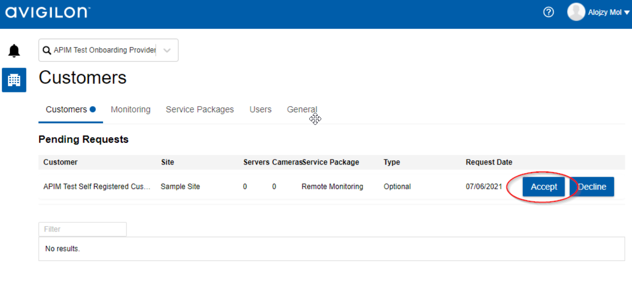 When the Customer Organization applies the code, it becomes visible on the Customers list as a Pending Request (see the figure). Accept the request.