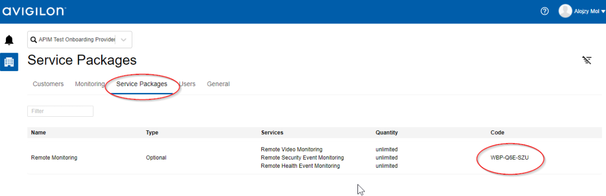 To acquire access to Customer Organizations owned video sources, they need to grant you access to the video sources connected to their ACS sites. They do this by using the Service Package Code that you provide to them. To access your Service Package Code, navigate to the Service Packages tab on the landing page and observe the code provided for the factory generated Remote Monitoring package.