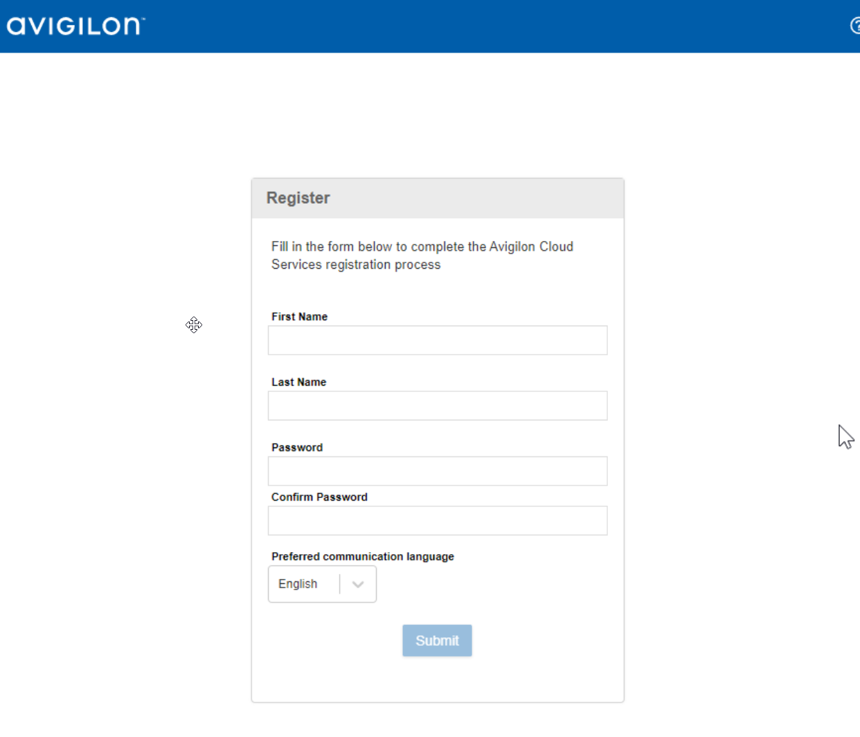 When you receive an invitation email from the Avigilon Cloud Services Team, complete the registration process by providing your First Name, Last Name and a new password (see the figure).